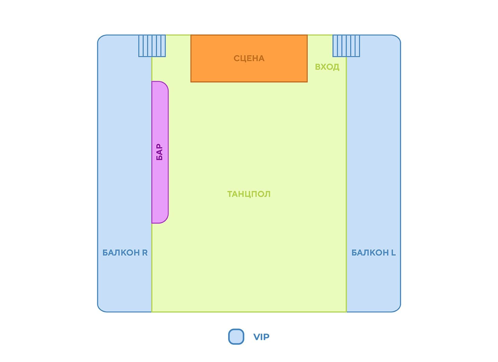 VIP — доступ на балкон с хорошим видом на сцену, персональное обслуживание официантами, доступ во все бары на площадке, гардероб.