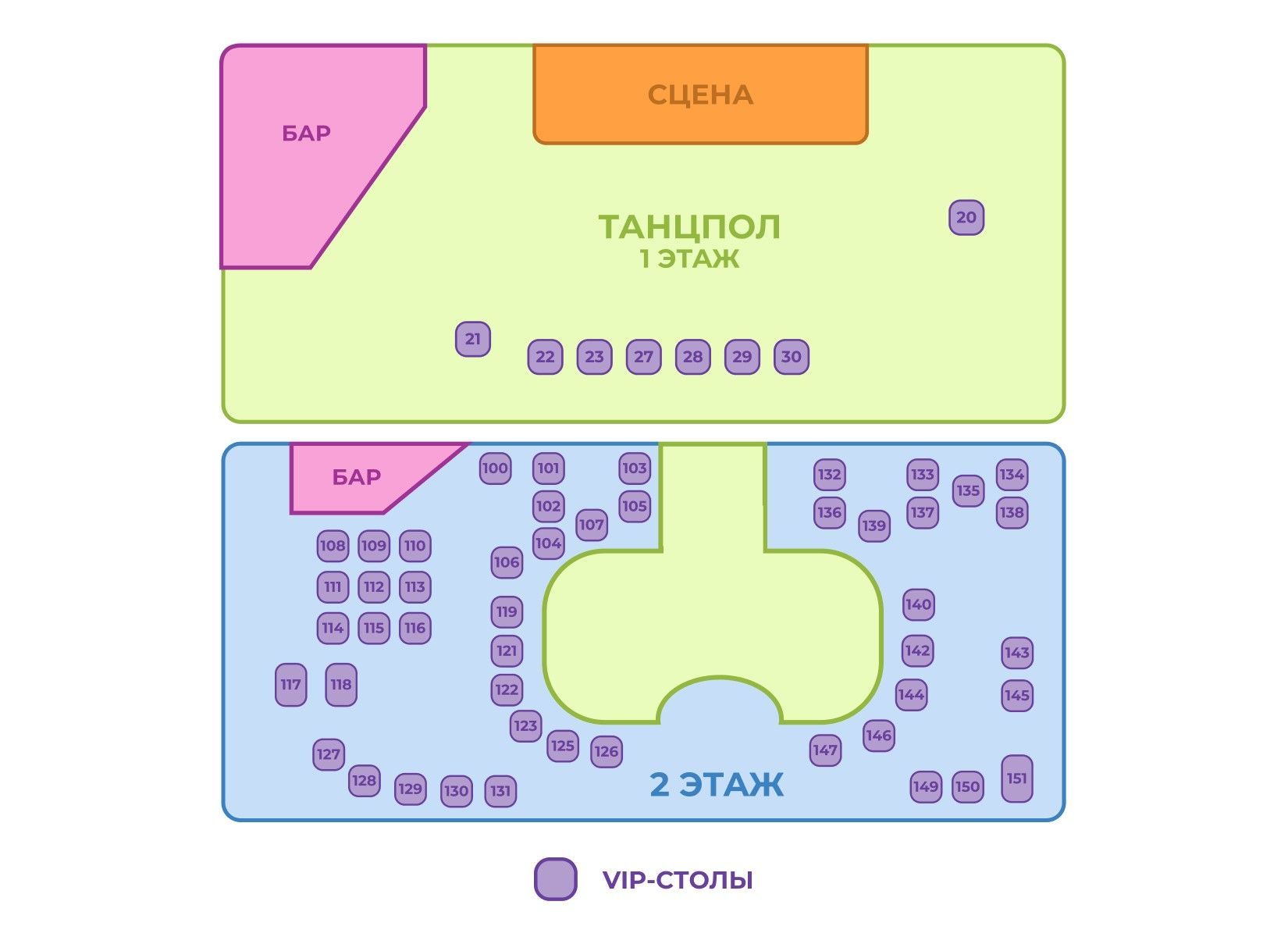 VIP — место за столом с хорошим видом на сцену на 1 или 2 этаже, персональное обслуживание официантами, доступ во все бары на площадке, гардероб.
