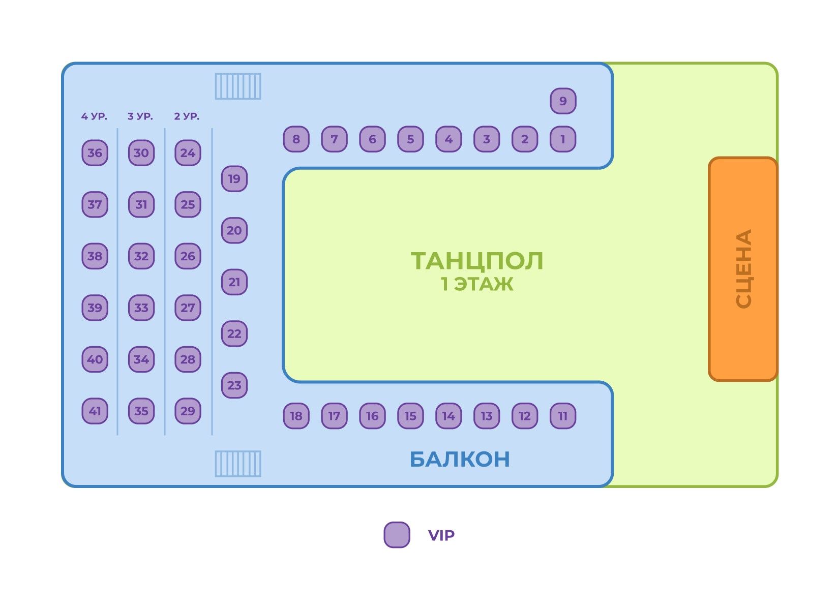 VIP — место за столом на балконе с хорошим видом на сцену, персональное обслуживание официантами, доступ во все бары на площадке, гардероб.