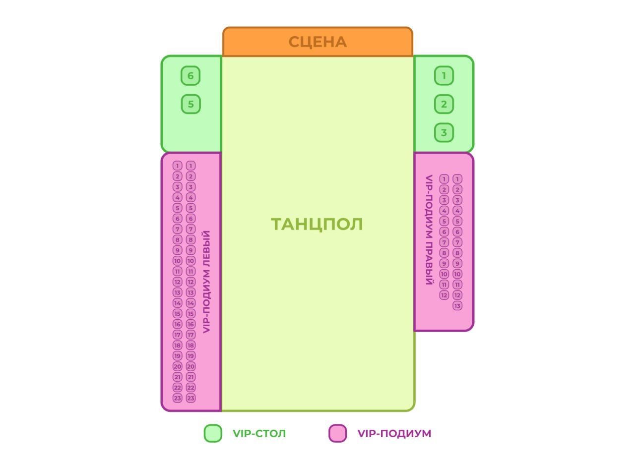 VIP ПОДИУМ — сидячее место на подиуме с хорошим видом на сцену, персональное обслуживание официантами, доступ во все бары на площадке, гардероб.